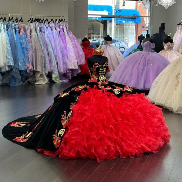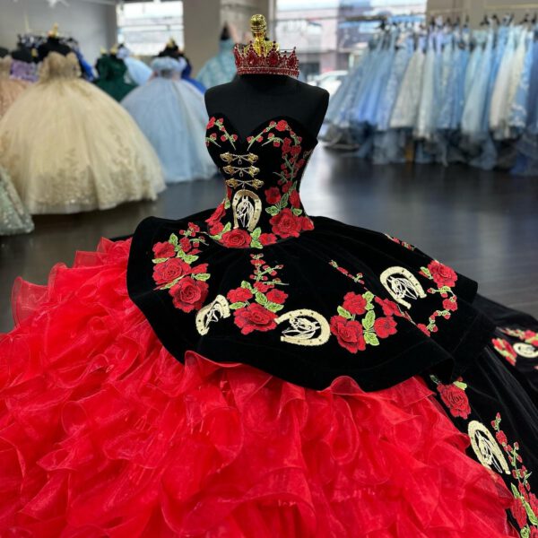 Una obra maestra que combina la pasión y el patrimonio cultural mexicano. Este diseño impactante presenta un corsé negro adornado con intrincados bordados de rosas rojas y detalles dorados, inspirados en la tradicional vestimenta de charro.